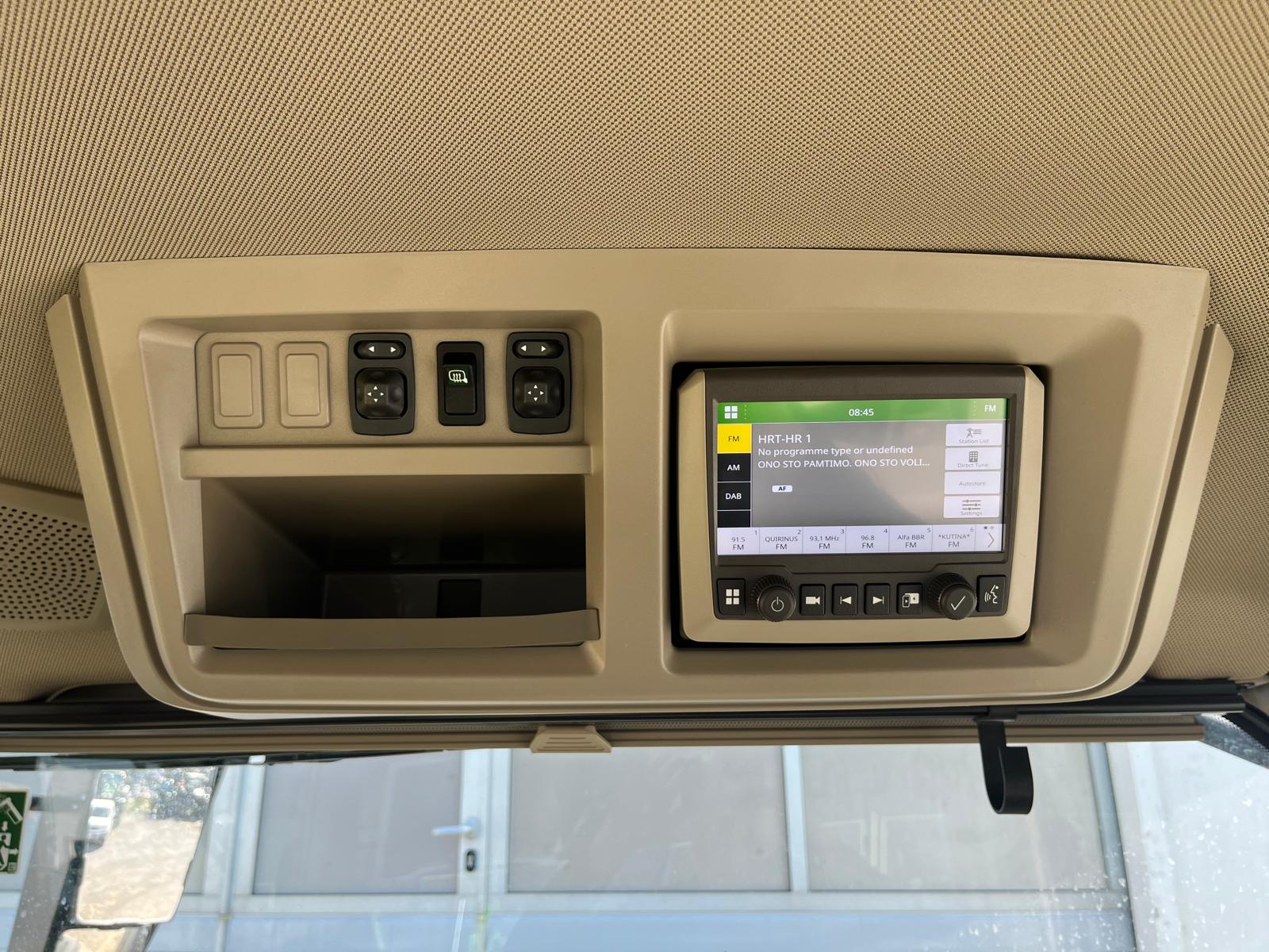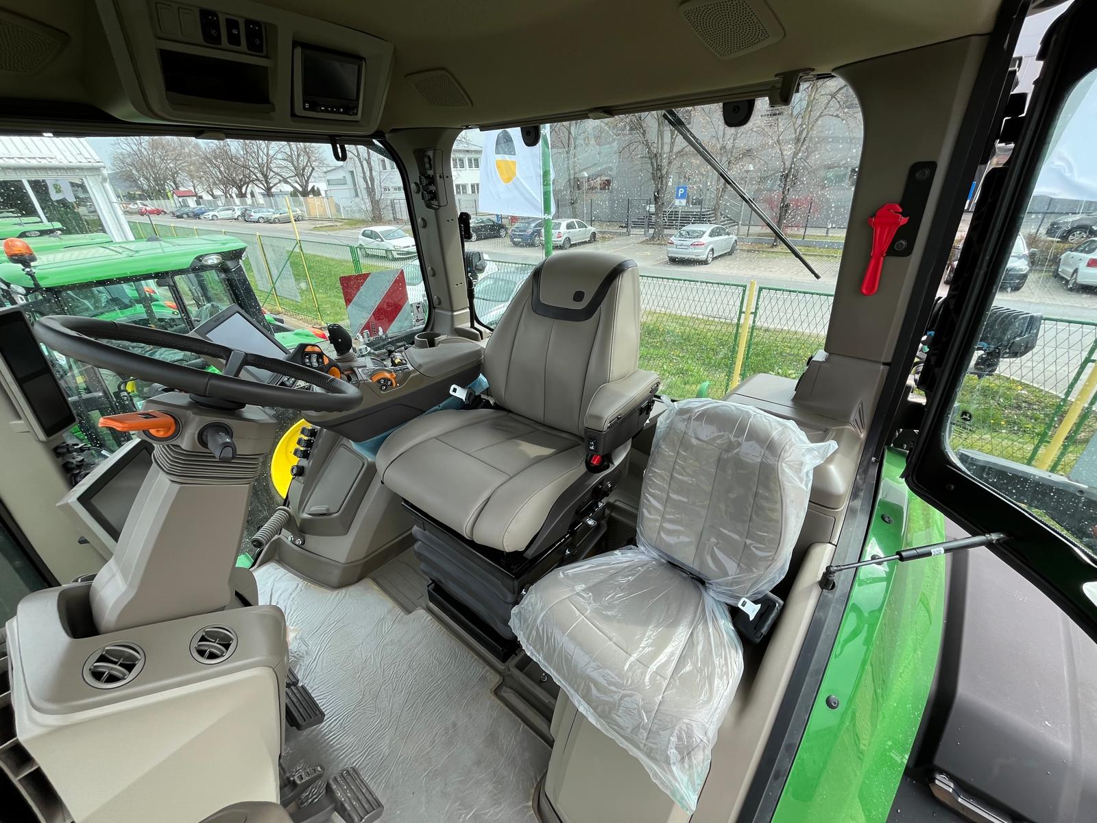 Premium kabina sa klima uređajem i grijanjem sa mehaničkom suspenzijom, teleskopski vanjski retrovizori lijevi i desni, unutrašnji retrovizor, super komforno vozačko sjedalo sa zračnom suspenzijom, monitor na stupu kabine koji prikazuje sve parametre traktora, nagibni i teleskopski upravljač, fiksno vjetrobransko staklo, brisač s pranjem vjetrobranskog stakla, radio sa Bluetooth-om, sjenilo za sunce, unutrašnje osvjetljenje – krovno svjetlo i osvjetljenje desne konzole, suvozačko sjedalo, brisač stražnjeg stakla, upravljač presvučen kožom